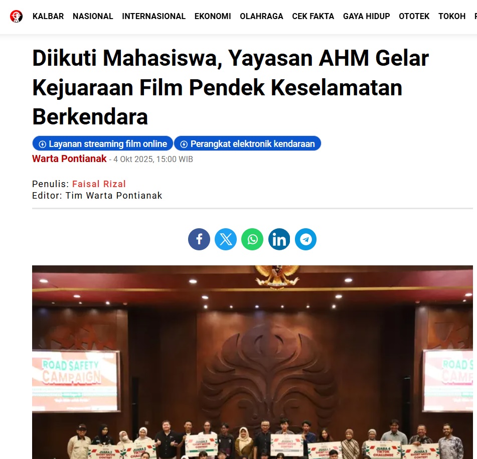 Diikuti Mahasiswa, Yayasan AHM Gelar Kejuaraan Film Pendek Keselamatan Berkendara by Faisal Rizal 4 Oktober 2025 in Silahkan kunjungi https://wartapontianak.pikiran-rakyat.com/gaya-hidup/pr-1179693624/diikuti-mahasiswa-yayasan-ahm-gelar-kejuaraan-film-pendek-keselamatan-berkendara. You Might Like Regional Public Launching New ADV160 The SUV Pride Grand Launching New PCX 160 Truly Exceptional! Tetap hati-hati ya bro sist berkendara saat hujan.