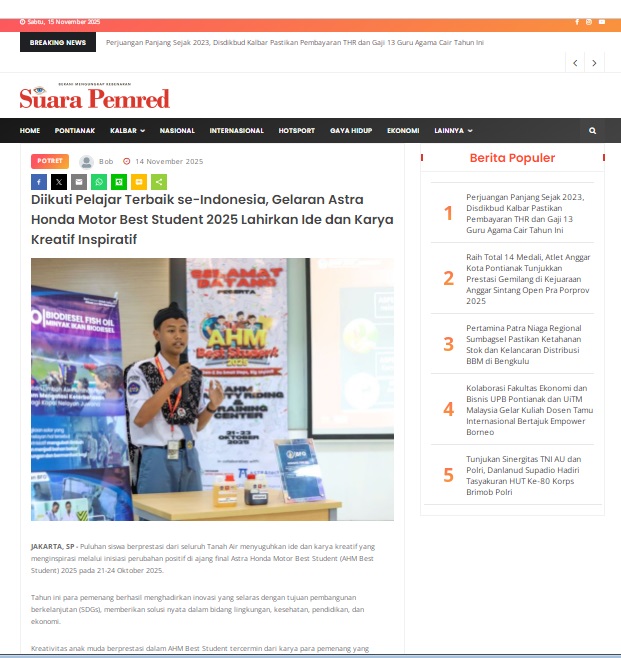 Diikuti Pelajar Terbaik se-Indonesia, Gelaran Astra Honda Motor Best Student 2025 Lahirkan Ide dan Karya Kreatif Inspiratif by masmul 14 November 2025 in Silahkan kunjungi https://www.suarapemredkalbar.com/read/potret/14112025/diikuti-pelajar-terbaik-se-indonesia-gelaran-astra-honda-motor-best-student-2025-lahirkan-ide-dan-karya-kreatif-inspiratif. You Might Like Regional Public Launching New ADV160 The SUV Pride Grand Launching New PCX 160 Truly Exceptional! Tetap hati-hati ya bro sist berkendara saat hujan.