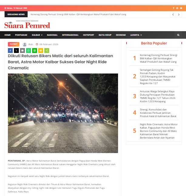 Diikuti Ratusan Bikers Matic dari seluruh Kalimantan Barat, Astra Motor Kalbar Sukses Gelar Night Ride Cinematic by masmul 8 Februari 2026 in Silahkan kunjungi https://www.suarapemredkalbar.com/read/potret/08022026/diikuti-ratusan-bikers-matic-dari-seluruh-kalimantan-barat-astra-motor-kalbar-sukses-gelar-night-ride-cinematic. You Might Like Regional Public Launching New ADV160 The SUV Pride Grand Launching New PCX 160 Truly Exceptional! Tetap hati-hati ya bro sist berkendara saat hujan.
