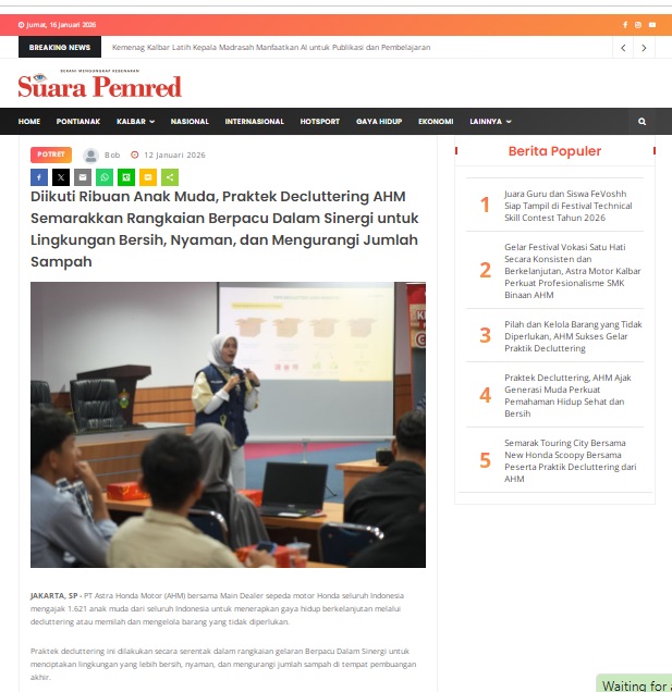 Diikuti Ribuan Anak Muda, Praktek Decluttering AHM Semarakkan Rangkaian Berpacu Dalam Sinergi untuk Lingkungan Bersih, Nyaman, dan Mengurangi Jumlah Sampah by masmul 12 Januari 2026 in Silahkan kunjungi https://www.suarapemredkalbar.com/read/potret/12012026/diikuti-ribuan-anak-muda-praktek-decluttering-ahm-semarakkan-rangkaian-berpacu-dalam-sinergi-untuk-lingkungan-bersih-nyaman-dan-mengurangi-jumlah-sampah. You Might Like Regional Public Launching New ADV160 The SUV Pride Grand Launching New PCX 160 Truly Exceptional! Tetap hati-hati ya bro sist berkendara saat hujan.