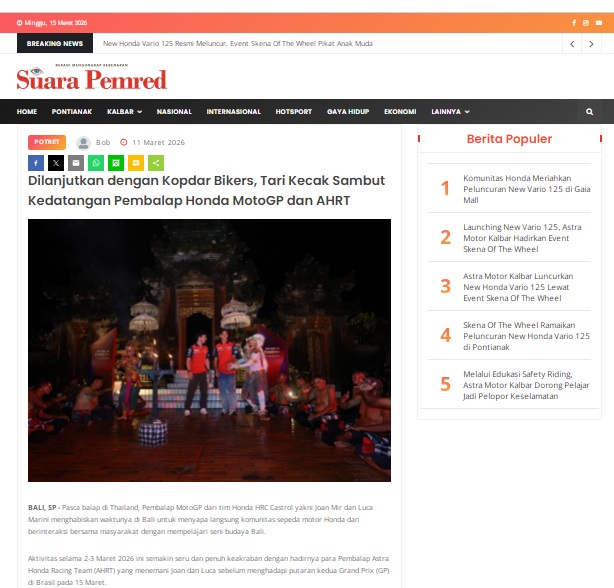 Dilanjutkan dengan Kopdar Bikers, Tari Kecak Sambut Kedatangan Pembalap Honda MotoGP dan AHRT by masmul 11 Maret 2026 in Silahkan kunjungi https://www.suarapemredkalbar.com/read/potret/11032026/dilanjutkan-dengan-kopdar-bikers-tari-kecak-sambut-kedatangan-pembalap-honda-motogp-dan-ahrt. You Might Like Regional Public Launching New ADV160 The SUV Pride Grand Launching New PCX 160 Truly Exceptional! Tetap hati-hati ya bro sist berkendara saat hujan.