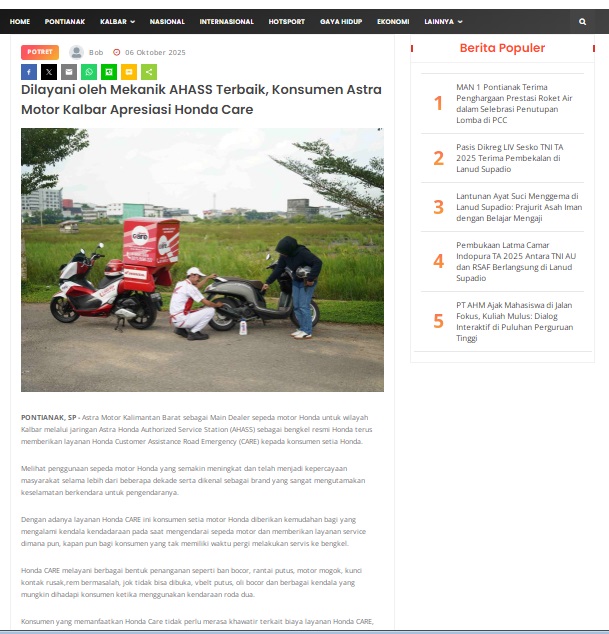 Dilayani oleh Mekanik AHASS Terbaik, Konsumen Astra Motor Kalbar Apresiasi Honda Care by masmul 6 Oktober 2025 in Silahkan kunjungi https://www.suarapemredkalbar.com/read/potret/06102025/dilayani-oleh-mekanik-ahass-terbaik-konsumen-astra-motor-kalbar-apresiasi-honda-care. You Might Like Regional Public Launching New ADV160 The SUV Pride Grand Launching New PCX 160 Truly Exceptional! Tetap hati-hati ya bro sist berkendara saat hujan.