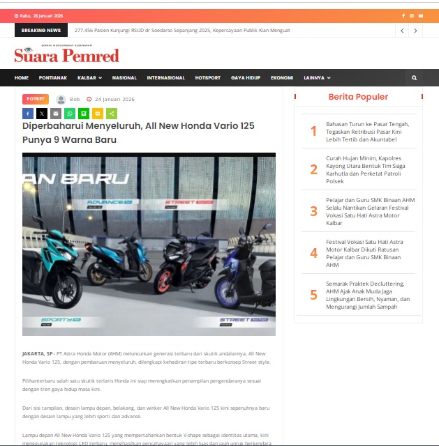 Diperbaharui Menyeluruh, All New Honda Vario 125 Punya 9 Warna Baru by masmul 24 Januari 2026 in Silahkan kunjungi https://www.suarapemredkalbar.com/read/potret/24012026/diperbaharui-menyeluruh-all-new-honda-vario-125-punya-9-warna-baru. You Might Like Regional Public Launching New ADV160 The SUV Pride Grand Launching New PCX 160 Truly Exceptional! Tetap hati-hati ya bro sist berkendara saat hujan.