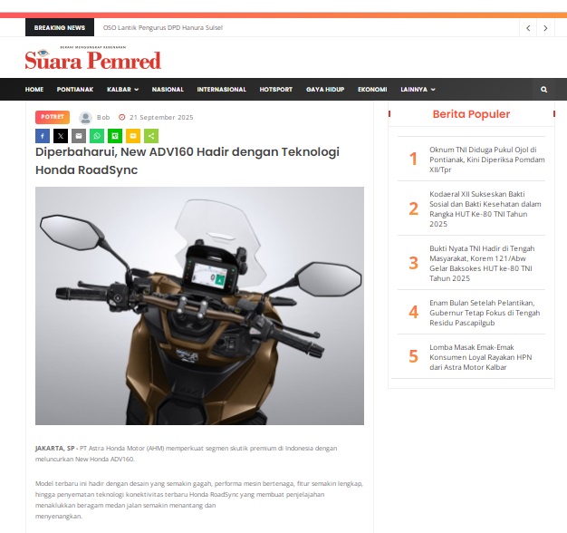 Diperbaharui, New ADV160 Hadir dengan Teknologi Honda RoadSync by masmul 21 September 2025 in Silahkan kunjungi https://www.suarapemredkalbar.com/read/potret/21092025/diperbaharui-new-adv160-hadir-dengan-teknologi-honda-roadsync. You Might Like Regional Public Launching New ADV160 The SUV Pride Grand Launching New PCX 160 Truly Exceptional! Tetap hati-hati ya bro sist berkendara saat hujan.