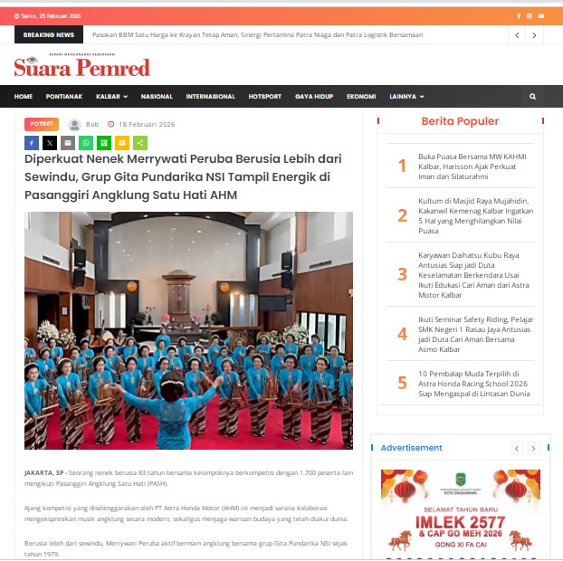 Diperkuat Nenek Merrywati Peruba Berusia Lebih dari Sewindu, Grup Gita Pundarika NSI Tampil Energik di Pasanggiri Angklung Satu Hati AHM by masmul 18 Februari 2026 in Silahkan kunjungi https://www.suarapemredkalbar.com/read/potret/18022026/diperkuat-nenek-merrywati-peruba-berusia-lebih-dari-sewindu-grup-gita-pundarika-nsi-tampil-energik-di-pasanggiri-angklung-satu-hati-ahm. You Might Like Regional Public Launching New ADV160 The SUV Pride Grand Launching New PCX 160 Truly Exceptional! Tetap hati-hati ya bro sist berkendara saat hujan.