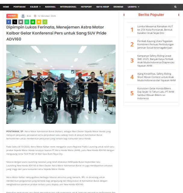 Dipimpin Lukas Ferinata, Menejemen Astra Motor Kalbar Gelar Konferensi Pers untuk Sang SUV Pride ADV160 by masmul 12 Oktober 2025 in Silahkan kunjungi https://www.suarapemredkalbar.com/read/potret/12102025/dipimpin-lukas-ferinata-menejemen-astra-motor-kalbar-gelar-konferensi-pers-untuk-sang-suv-pride-adv160. You Might Like Regional Public Launching New ADV160 The SUV Pride Grand Launching New PCX 160 Truly Exceptional! Tetap hati-hati ya bro sist berkendara saat hujan.