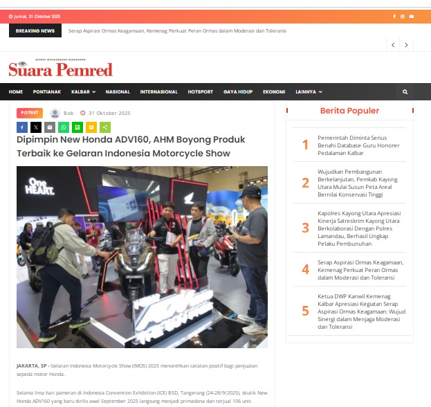 Dipimpin New Honda ADV160, AHM Boyong Produk Terbaik ke Gelaran Indonesia Motorcycle Show by masmul 31 Oktober 2025 in Silahkan kunjungi https://www.suarapemredkalbar.com/read/potret/31102025/dipimpin-new-honda-adv160-ahm-boyong-produk-terbaik-ke-gelaran-indonesia-motorcycle-show. You Might Like Regional Public Launching New ADV160 The SUV Pride Grand Launching New PCX 160 Truly Exceptional! Tetap hati-hati ya bro sist berkendara saat hujan.