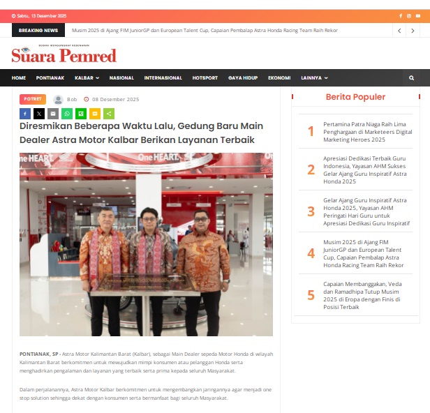 Diresmikan Beberapa Waktu Lalu, Gedung Baru Main Dealer Astra Motor Kalbar Berikan Layanan Terbaik by masmul 8 Desember 2025 in Silahkan kunjungi https://www.suarapemredkalbar.com/read/potret/08122025/diresmikan-beberapa-waktu-lalu-gedung-baru-main-dealer-astra-motor-kalbar-berikan-layanan-terbaik. You Might Like Regional Public Launching New ADV160 The SUV Pride Grand Launching New PCX 160 Truly Exceptional! Tetap hati-hati ya bro sist berkendara saat hujan.
