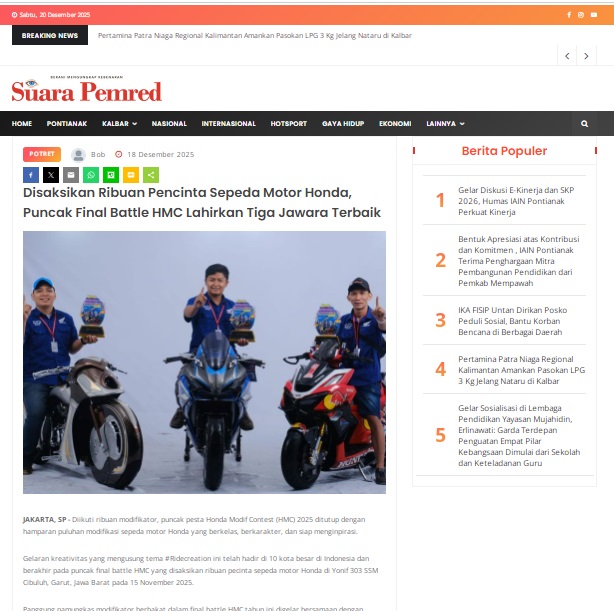 Disaksikan Ribuan Pencinta Sepeda Motor Honda, Puncak Final Battle HMC Lahirkan Tiga Jawara Terbaik by masmul 18 Desember 2025 in Silahkan kunjungi https://www.suarapemredkalbar.com/read/potret/18122025/disaksikan-ribuan-pencinta-sepeda-motor-honda-puncak-final-battle-hmc-lahirkan-tiga-jawara-terbaik. You Might Like Regional Public Launching New ADV160 The SUV Pride Grand Launching New PCX 160 Truly Exceptional! Tetap hati-hati ya bro sist berkendara saat hujan.