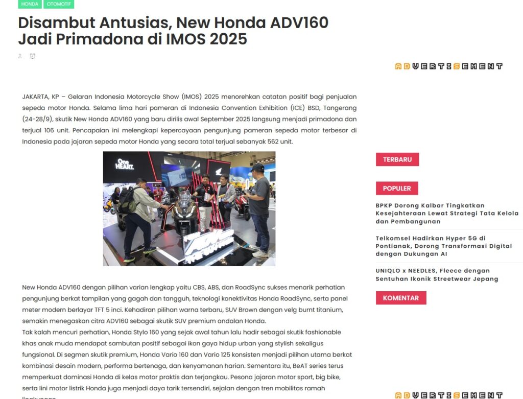 Disambut Antusias, New Honda ADV160 Jadi Primadona di IMOS 2025 by Muhammad Arif 1 Oktober 2025 in Silahkan kunjungi https://www.kapuaspost.web.id/2025/10/disambut-antusias-new-honda-adv160-jadi.htaml. Tags: astra Astra Motor kalbar Astra Motor Pontianak astramotor honda kalbar pontianak sepeda motor You Might Like Regional Public Launching New ADV160 The SUV Pride Grand Launching New PCX 160 Truly Exceptional! Tetap hati-hati ya bro sist berkendara saat hujan.