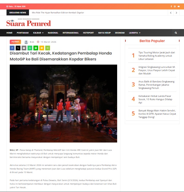 Disambut Tari Kecak, Kedatangan Pembalap Honda MotoGP ke Bali Disemarakkan Kopdar Bikers by masmul 15 Maret 2026 in Silahkan kunjungi https://www.suarapemredkalbar.com/read/potret/15032026/disambut-tari-kecak-kedatangan-pembalap-honda-motogp-ke-bali-disemarakkan-kopdar-bikers. You Might Like Regional Public Launching New ADV160 The SUV Pride Grand Launching New PCX 160 Truly Exceptional! Tetap hati-hati ya bro sist berkendara saat hujan.