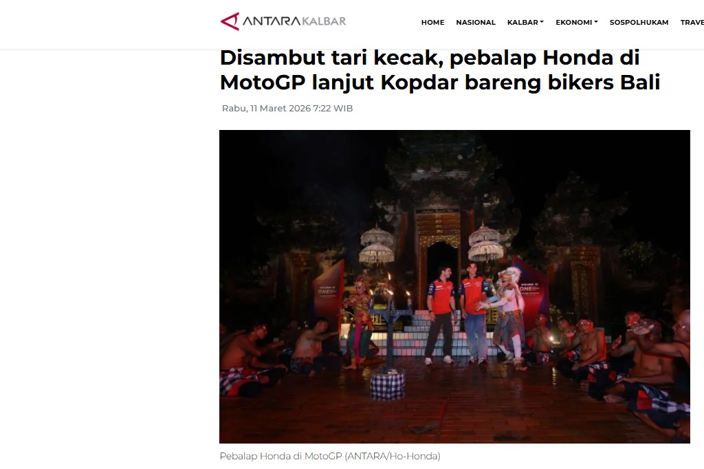 Disambut tari kecak, pebalap Honda di MotoGP lanjut Kopdar bareng bikers Bali by Dedi 11 Maret 2026 in Silahkan kunjungi https://kalbar.antaranews.com/berita/693623/disambut-tari-kecak-pebalap-honda-di-motogp-lanjut-kopdar-bareng-bikers-bali. You Might Like Regional Public Launching New ADV160 The SUV Pride Grand Launching New PCX 160 Truly Exceptional! Tetap hati-hati ya bro sist berkendara saat hujan.
