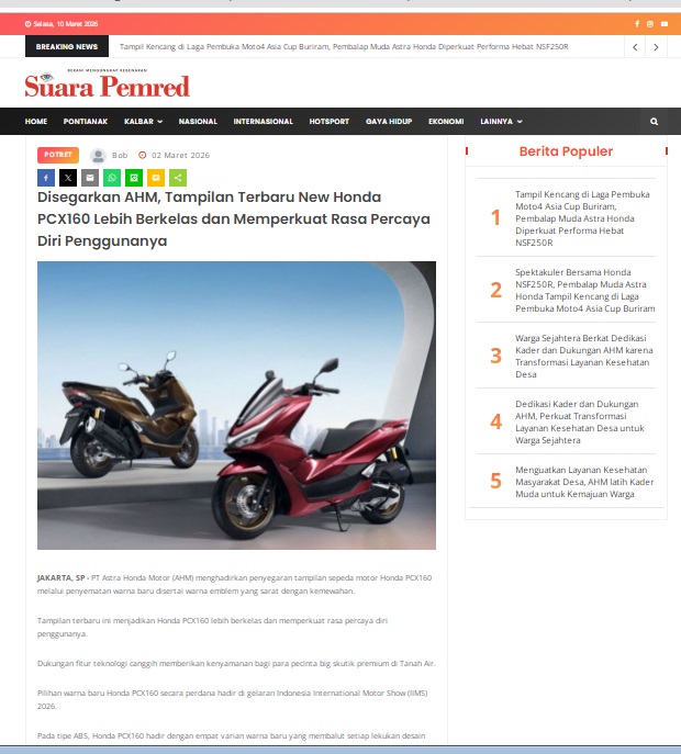 Disegarkan AHM, Tampilan Terbaru New Honda PCX160 Lebih Berkelas dan Memperkuat Rasa Percaya Diri Penggunanya by masmul 2 Maret 2026 in Silahkan kunjungi https://www.suarapemredkalbar.com/read/potret/02032026/disegarkan-ahm-tampilan-terbaru-new-honda-pcx160-lebih-berkelas-dan-memperkuat-rasa-percaya-diri-penggunanya. You Might Like Regional Public Launching New ADV160 The SUV Pride Grand Launching New PCX 160 Truly Exceptional! Tetap hati-hati ya bro sist berkendara saat hujan.