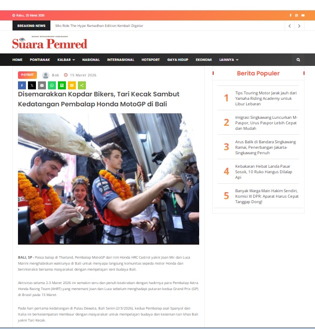 Disemarakkan Kopdar Bikers, Tari Kecak Sambut Kedatangan Pembalap Honda MotoGP di Bali by masmul 15 Maret 2026 in Silahkan kunjungi https://www.suarapemredkalbar.com/read/potret/15032026/disemarakkan-kopdar-bikers-tari-kecak-sambut-kedatangan-pembalap-honda-motogp-di-bali. You Might Like Regional Public Launching New ADV160 The SUV Pride Grand Launching New PCX 160 Truly Exceptional! Tetap hati-hati ya bro sist berkendara saat hujan.