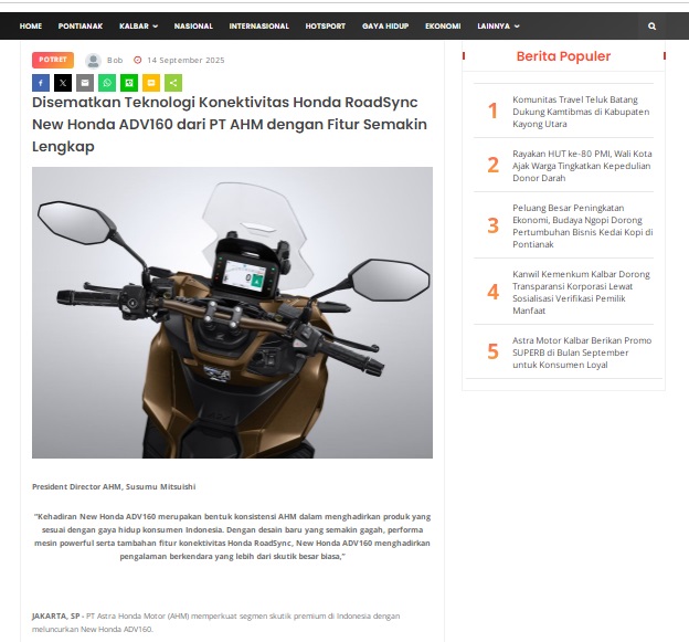 Disematkan Teknologi Konektivitas Honda RoadSync New Honda ADV160 dari PT AHM dengan Fitur Semakin Lengkap by masmul 14 September 2025 in Silahkan kunjungi https://www.suarapemredkalbar.com/read/potret/14092025/disematkan-teknologi-konektivitas-honda-roadsync-new-honda-adv160-dari-pt-ahm-dengan-fitur-semakin-lengkap. You Might Like Regional Public Launching New ADV160 The SUV Pride Grand Launching New PCX 160 Truly Exceptional! Tetap hati-hati ya bro sist berkendara saat hujan.