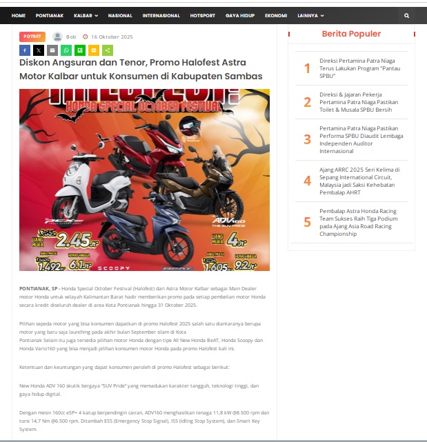 Diskon Angsuran dan Tenor, Promo Halofest Astra Motor Kalbar untuk Konsumen di Kabupaten Sambas by masmul 16 Oktober 2025 in Silahkan kunjungi https://www.suarapemredkalbar.com/read/potret/16102025/diskon-angsuran-dan-tenor-promo-halofest-astra-motor-kalbar-untuk-konsumen-di-kabupaten-sambas. You Might Like Regional Public Launching New ADV160 The SUV Pride Grand Launching New PCX 160 Truly Exceptional! Tetap hati-hati ya bro sist berkendara saat hujan.