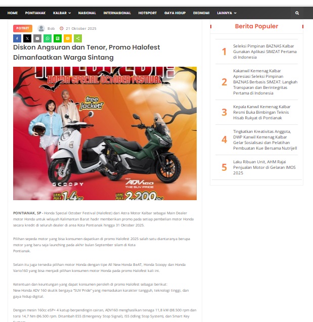 Diskon Angsuran dan Tenor, Promo Halofest Dimanfaatkan Warga Sintang by masmul 21 Oktober 2025 in Silahkan kunjungi https://www.suarapemredkalbar.com/read/potret/21102025/diskon-angsuran-dan-tenor-promo-halofest-dimanfaatkan-warga-sintang. You Might Like Regional Public Launching New ADV160 The SUV Pride Grand Launching New PCX 160 Truly Exceptional! Tetap hati-hati ya bro sist berkendara saat hujan.