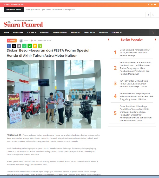 Diskon Besar-besaran dari PESTA Promo Spesial Honda di Akhir Tahun Astra Motor Kalbar by masmul 16 Desember 2025 in Silahkan kunjungi https://www.suarapemredkalbar.com/read/potret/16122025/diskon-besar-besaran-dari-pesta-promo-spesial-honda-di-akhir-tahun-astra-motor-kalbar. You Might Like Regional Public Launching New ADV160 The SUV Pride Grand Launching New PCX 160 Truly Exceptional! Tetap hati-hati ya bro sist berkendara saat hujan.