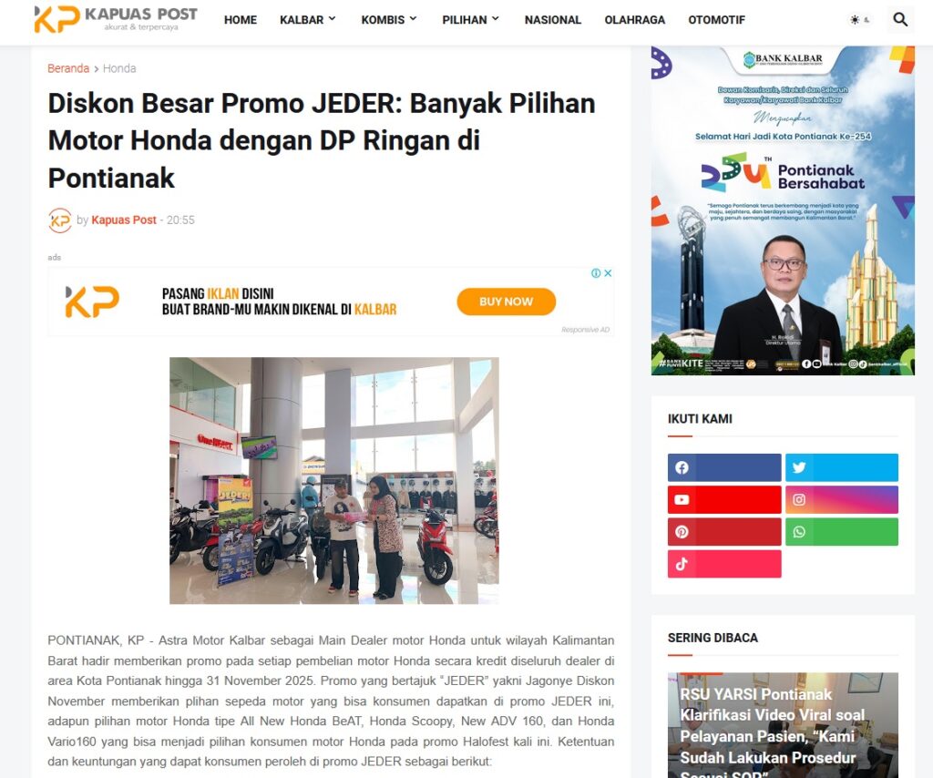 Diskon Besar Promo JEDER: Banyak Pilihan Motor Honda dengan DP Ringan di Pontianak by Muhammad Arif 12 November 2025 in Silahkan kunjungi https://www.kapuaspost.web.id/2025/11/diskon-besar-promo-jeder-banyak-pilihan.html. Tags: astra Astra Motor kalbar Astra Motor Pontianak astramotor honda kalbar pontianak sepeda motor You Might Like Regional Public Launching New ADV160 The SUV Pride Grand Launching New PCX 160 Truly Exceptional! Tetap hati-hati ya bro sist berkendara saat hujan.