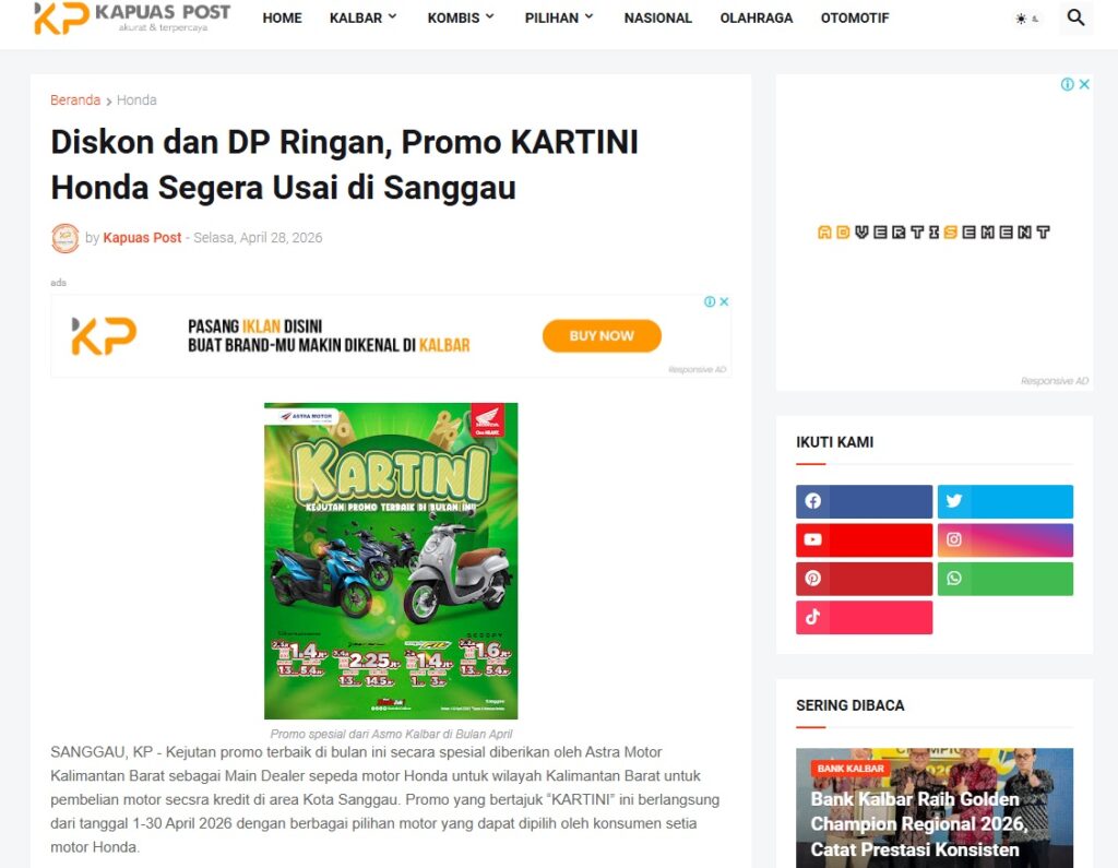 Diskon dan DP Ringan, Promo KARTINI Honda Segera Usai di Sanggau by Muhammad Arif 28 April 2026 in Silahkan kunjungi https://www.kapuaspost.web.id/2026/04/diskon-dan-dp-ringan-promo-kartini.html. Tags: astra Astra Motor kalbar Astra Motor Pontianak astramotor honda kalbar pontianak sepeda motor You Might Like Regional Public Launching New ADV160 The SUV Pride Grand Launching New PCX 160 Truly Exceptional! Tetap hati-hati ya bro sist berkendara saat hujan.