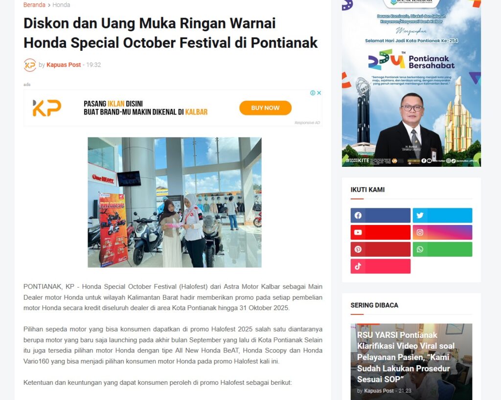 Diskon dan Uang Muka Ringan Warnai Honda Special October Festival di Pontianak by Muhammad Arif 27 Oktober 2025 in Silahkan kunjungi https://www.kapuaspost.web.id/2025/10/diskon-dan-uang-muka-ringan-warnai.html. Tags: astra Astra Motor kalbar Astra Motor Pontianak astramotor honda kalbar pontianak sepeda motor You Might Like Regional Public Launching New ADV160 The SUV Pride Grand Launching New PCX 160 Truly Exceptional! Tetap hati-hati ya bro sist berkendara saat hujan.