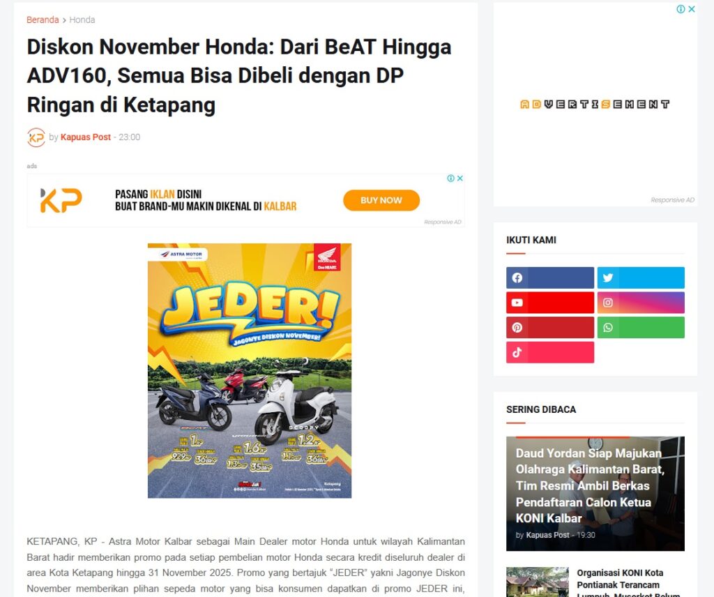 Diskon November Honda: Dari BeAT Hingga ADV160, Semua Bisa Dibeli dengan DP Ringan di Ketapang by Muhammad Arif 21 November 2025 in Silahkan kunjungi https://www.kapuaspost.web.id/2025/11/diskon-november-honda-dari-beat-hingga.html. Tags: astra Astra Motor kalbar Astra Motor Pontianak astramotor honda kalbar pontianak sepeda motor You Might Like Regional Public Launching New ADV160 The SUV Pride Grand Launching New PCX 160 Truly Exceptional! Tetap hati-hati ya bro sist berkendara saat hujan.