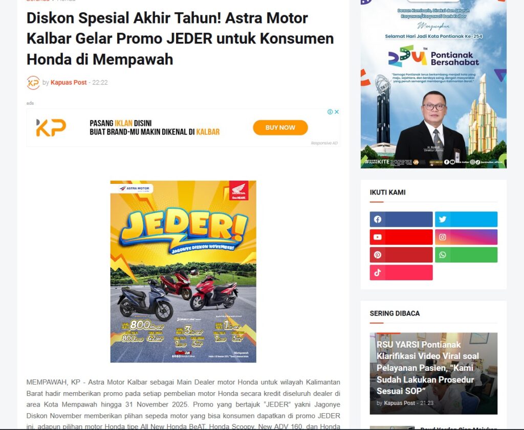 Diskon Spesial Akhir Tahun! Astra Motor Kalbar Gelar Promo JEDER untuk Konsumen Honda di Mempawah by Muhammad Arif 8 November 2025 in Silahkan kunjungi https://www.kapuaspost.web.id/2025/11/diskon-spesial-akhir-tahun-astra-motor.html. Tags: astra Astra Motor kalbar Astra Motor Pontianak astramotor honda kalbar pontianak sepeda motor You Might Like Regional Public Launching New ADV160 The SUV Pride Grand Launching New PCX 160 Truly Exceptional! Tetap hati-hati ya bro sist berkendara saat hujan.