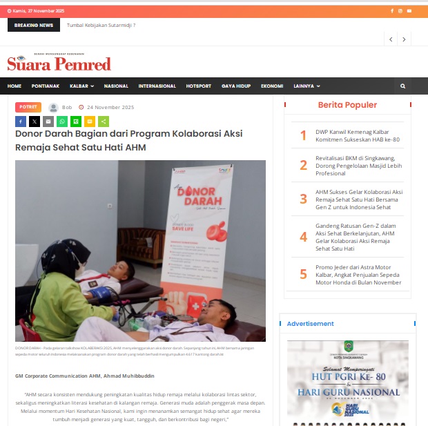 Donor Darah Bagian dari Program Kolaborasi Aksi Remaja Sehat Satu Hati AHM by masmul 24 November 2025 in Silahkan kunjungi https://www.suarapemredkalbar.com/read/potret/24112025/donor-darah-bagian-dari-program-kolaborasi-aksi-remaja-sehat-satu-hati-ahm. You Might Like Regional Public Launching New ADV160 The SUV Pride Grand Launching New PCX 160 Truly Exceptional! Tetap hati-hati ya bro sist berkendara saat hujan.