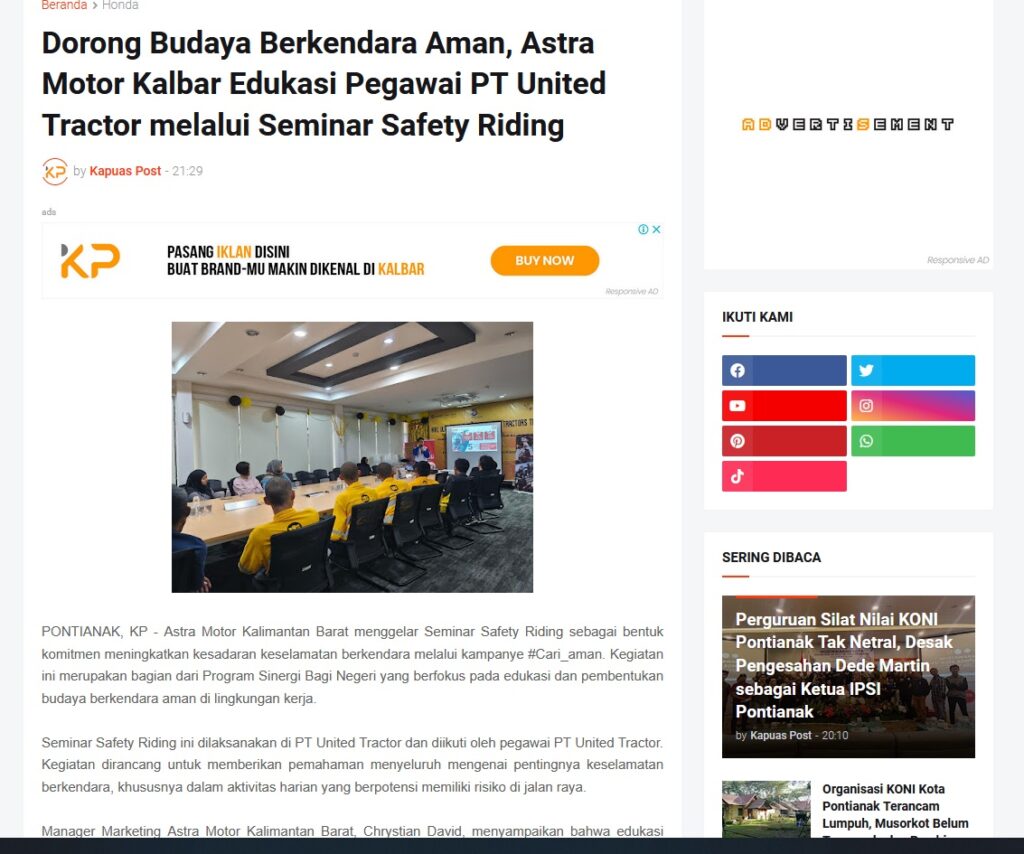 Dorong Budaya Berkendara Aman, Astra Motor Kalbar Edukasi Pegawai PT United Tractor melalui Seminar Safety Riding by Muhammad Arif 19 Desember 2025 in Silahkan kunjungi https://www.kapuaspost.web.id/2025/12/dorong-budaya-berkendara-aman-astra.html. Tags: astra Astra Motor kalbar Astra Motor Pontianak astramotor honda kalbar pontianak sepeda motor You Might Like Regional Public Launching New ADV160 The SUV Pride Grand Launching New PCX 160 Truly Exceptional! Tetap hati-hati ya bro sist berkendara saat hujan.
