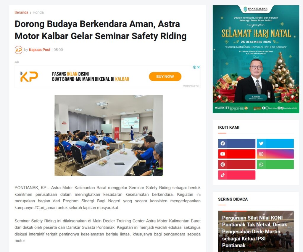 Dorong Budaya Berkendara Aman, Astra Motor Kalbar Gelar Seminar Safety Riding by Muhammad Arif 29 Desember 2025 in Silahkan kunjungi https://www.kapuaspost.web.id/2025/12/dorong-budaya-berkendara-aman-astra_29.html. Tags: astra Astra Motor kalbar Astra Motor Pontianak astramotor honda kalbar pontianak sepeda motor You Might Like Regional Public Launching New ADV160 The SUV Pride Grand Launching New PCX 160 Truly Exceptional! Tetap hati-hati ya bro sist berkendara saat hujan.