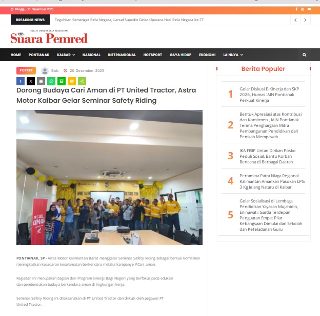 Dorong Budaya Cari Aman di PT United Tractor, Astra Motor Kalbar Gelar Seminar Safety Riding by masmul 20 Desember 2025 in Silahkan kunjungi https://www.suarapemredkalbar.com/read/potret/20122025/dorong-budaya-cari-aman-di-pt-united-tractor-astra-motor-kalbar-gelar-seminar-safety-riding. You Might Like Regional Public Launching New ADV160 The SUV Pride Grand Launching New PCX 160 Truly Exceptional! Tetap hati-hati ya bro sist berkendara saat hujan.
