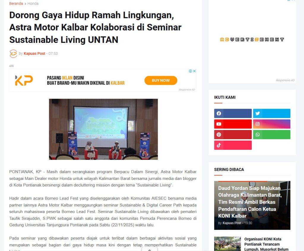 Dorong Gaya Hidup Ramah Lingkungan, Astra Motor Kalbar Kolaborasi di Seminar Sustainable Living UNTAN by Muhammad Arif 5 Desember 2025 in Silahkan kunjungi https://www.kapuaspost.web.id/2025/12/dorong-gaya-hidup-ramah-lingkungan.html. Tags: astra Astra Motor kalbar Astra Motor Pontianak astramotor honda kalbar pontianak sepeda motor You Might Like Regional Public Launching New ADV160 The SUV Pride Grand Launching New PCX 160 Truly Exceptional! Tetap hati-hati ya bro sist berkendara saat hujan.