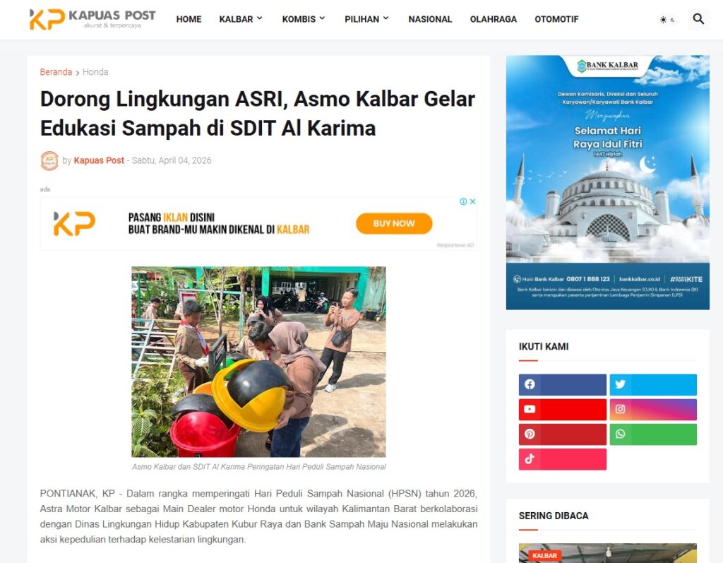Dorong Lingkungan ASRI, Asmo Kalbar Gelar Edukasi Sampah di SDIT Al Karima by Muhammad Arif 4 April 2026 in Silahkan kunjungi https://www.kapuaspost.web.id/2026/04/dorong-lingkungan-asri-asmo-kalbar.html. Tags: astra Astra Motor kalbar Astra Motor Pontianak astramotor honda kalbar pontianak sepeda motor You Might Like Regional Public Launching New ADV160 The SUV Pride Grand Launching New PCX 160 Truly Exceptional! Tetap hati-hati ya bro sist berkendara saat hujan.