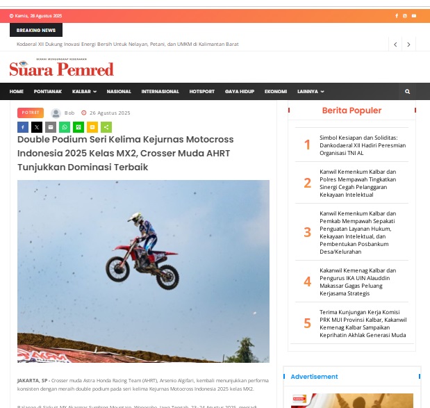 Double Podium Seri Kelima Kejurnas Motocross Indonesia 2025 Kelas MX2, Crosser Muda AHRT Tunjukkan Dominasi Terbaik by masmul 26 Agustus 2025 in Silahkan kunjungi https://www.suarapemredkalbar.com/read/potret/26082025/double-podium-seri-kelima-kejurnas-motocross-indonesia-2025-kelas-mx2-crosser-muda-ahrt-tunjukkan-dominasi-terbaik. You Might Like Regional Public Launching New ADV160 The SUV Pride Grand Launching New PCX 160 Truly Exceptional! Tetap hati-hati ya bro sist berkendara saat hujan.