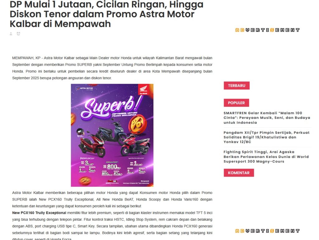 DP Mulai 1 Jutaan, Cicilan Ringan, Hingga Diskon Tenor dalam Promo Astra Motor Kalbar di Mempawah by Muhammad Arif 10 September 2025 in Silahkan kunjungi https://www.kapuaspost.web.id/2025/09/dp-mulai-1-jutaan-cicilan-ringan-hingga.html. Tags: astra Astra Motor kalbar Astra Motor Pontianak astramotor honda kalbar pontianak sepeda motor You Might Like Regional Public Launching New ADV160 The SUV Pride Grand Launching New PCX 160 Truly Exceptional! Tetap hati-hati ya bro sist berkendara saat hujan.