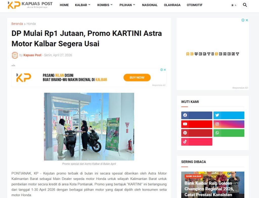 DP Mulai Rp1 Jutaan, Promo KARTINI Astra Motor Kalbar Segera Usai by Muhammad Arif 27 April 2026 in Silahkan kunjungi https://www.kapuaspost.web.id/2026/04/dp-mulai-rp1-jutaan-promo-kartini-astra.html. Tags: astra Astra Motor kalbar Astra Motor Pontianak astramotor honda kalbar pontianak sepeda motor You Might Like Regional Public Launching New ADV160 The SUV Pride Grand Launching New PCX 160 Truly Exceptional! Tetap hati-hati ya bro sist berkendara saat hujan.