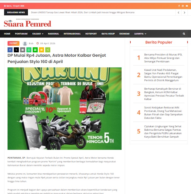 DP Mulai Rp4 Jutaan, Astra Motor Kalbar Genjot Penjualan Stylo 160 di April by masmul 9 April 2026 in Silahkan kunjungi https://www.suarapemredkalbar.com/read/potret/09042026/dp-mulai-rp4-jutaan-astra-motor-kalbar-genjot-penjualan-stylo-160-di-april. You Might Like Regional Public Launching New ADV160 The SUV Pride Grand Launching New PCX 160 Truly Exceptional! Tetap hati-hati ya bro sist berkendara saat hujan.