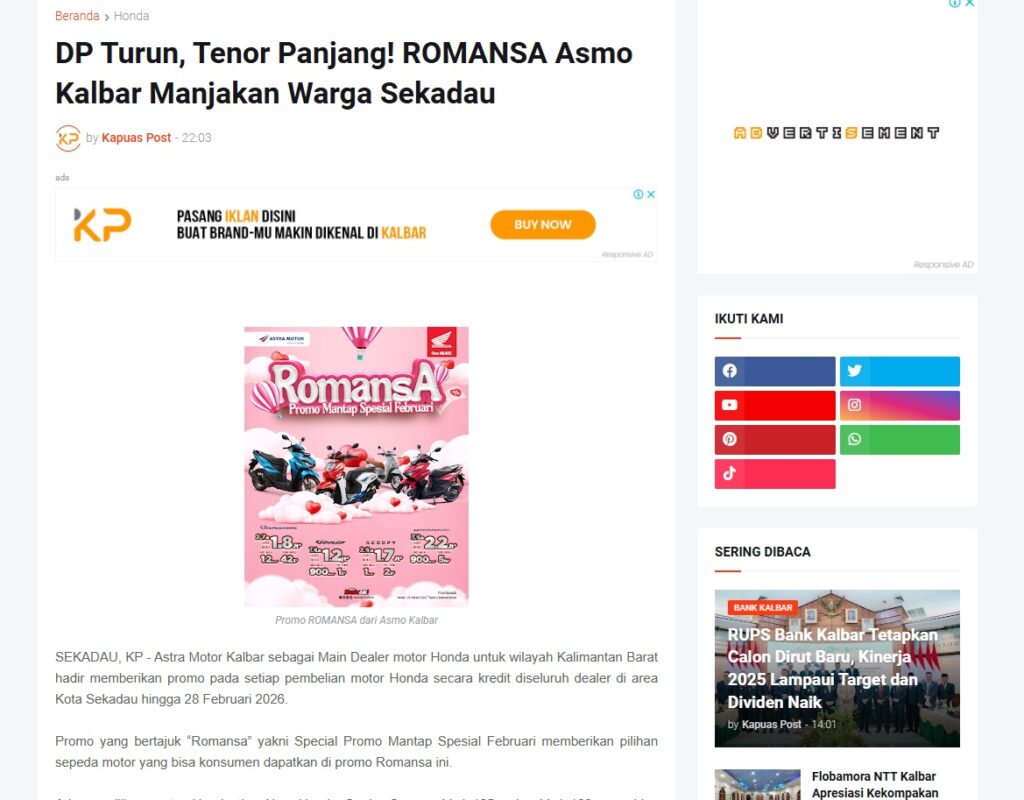 DP Turun, Tenor Panjang! ROMANSA Asmo Kalbar Manjakan Warga Sekadau by Muhammad Arif 9 Februari 2026 in Silahkan kunjungi https://www.kapuaspost.web.id/2026/02/dp-turun-tenor-panjang-romansa-asmo.html. Tags: astra Astra Motor kalbar Astra Motor Pontianak astramotor honda kalbar pontianak sepeda motor You Might Like Regional Public Launching New ADV160 The SUV Pride Grand Launching New PCX 160 Truly Exceptional! Tetap hati-hati ya bro sist berkendara saat hujan.