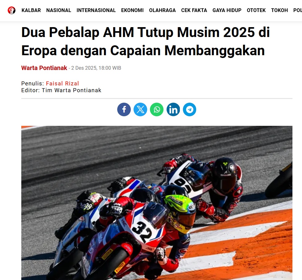 Dua Pebalap AHM Tutup Musim 2025 di Eropa dengan Capaian Membanggakan by Faisal Rizal 2 Desember 2025 in Silahkan kunjungi https://wartapontianak.pikiran-rakyat.com/olahraga/pr-1179833197/dua-pebalap-ahm-tutup-musim-2025-di-eropa-dengan-capaian-membanggakan. You Might Like Regional Public Launching New ADV160 The SUV Pride Grand Launching New PCX 160 Truly Exceptional! Tetap hati-hati ya bro sist berkendara saat hujan.