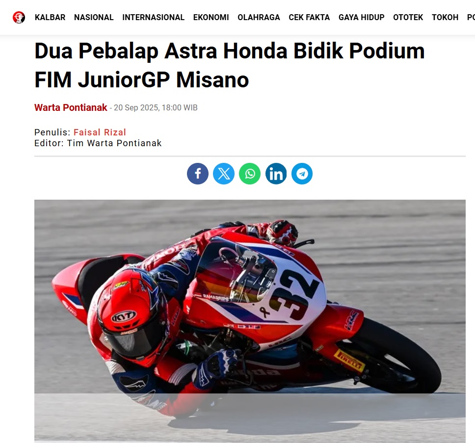 Dua Pebalap Astra Honda Bidik Podium FIM JuniorGP Misano by Faisal Rizal 20 September 2025 in Silahkan kunjungi https://wartapontianak.pikiran-rakyat.com/olahraga/pr-1179659532/dua-pebalap-astra-honda-bidik-podium-fim-juniorgp-misano. You Might Like Regional Public Launching New ADV160 The SUV Pride Grand Launching New PCX 160 Truly Exceptional! Tetap hati-hati ya bro sist berkendara saat hujan.