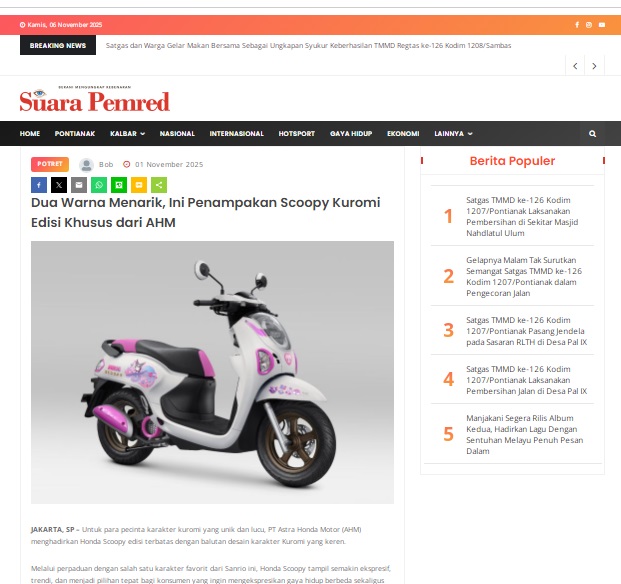 Dua Warna Menarik, Ini Penampakan Scoopy Kuromi Edisi Khusus dari AHM by masmul 1 November 2025 in Silahkan kunjungi https://www.suarapemredkalbar.com/read/potret/01112025/dua-warna-menarik-ini-penampakan-scoopy-kuromi-edisi-khusus-dari-ahm. You Might Like Regional Public Launching New ADV160 The SUV Pride Grand Launching New PCX 160 Truly Exceptional! Tetap hati-hati ya bro sist berkendara saat hujan.