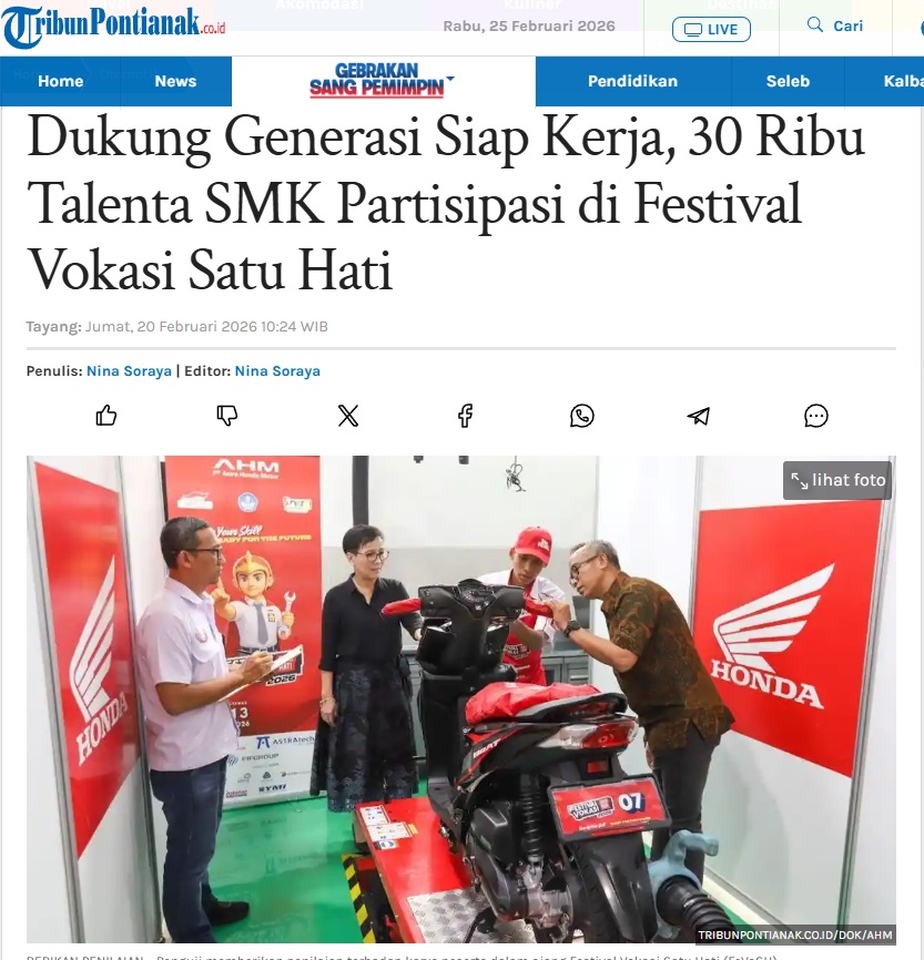 Dukung Generasi Siap Kerja, 30 Ribu Talenta SMK Partisipasi di Festival Vokasi Satu Hati by Nina Soraya 20 Februari 2026 in Silahkan kunjungi https://pontianak.tribunnews.com/otomotif/1162920/dukung-generasi-siap-kerja-30-ribu-talenta-smk-partisipasi-di-festival-vokasi-satu-hati. You Might Like Regional Public Launching New ADV160 The SUV Pride Grand Launching New PCX 160 Truly Exceptional! Tetap hati-hati ya bro sist berkendara saat hujan.