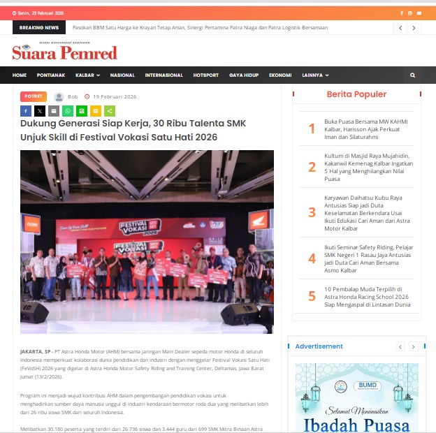 Dukung Generasi Siap Kerja, 30 Ribu Talenta SMK Unjuk Skill di Festival Vokasi Satu Hati 2026 by masmul 19 Februari 2026 in Silahkan kunjungi https://www.suarapemredkalbar.com/read/potret/19022026/dukung-generasi-siap-kerja-30-ribu-talenta-smk-unjuk-skill-di-festival-vokasi-satu-hati-2026. You Might Like Regional Public Launching New ADV160 The SUV Pride Grand Launching New PCX 160 Truly Exceptional! Tetap hati-hati ya bro sist berkendara saat hujan.