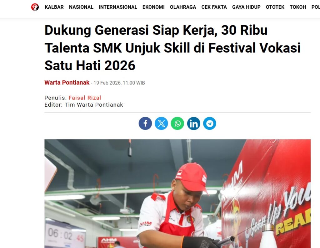 Dukung Generasi Siap Kerja, 30 Ribu Talenta SMK Unjuk Skill di Festival Vokasi Satu Hati 2026 by Faisal Rizal 19 Februari 2026 in Silahkan kunjungi https://wartapontianak.pikiran-rakyat.com/gaya-hidup/pr-11710018557/dukung-generasi-siap-kerja-30-ribu-talenta-smk-unjuk-skill-di-festival-vokasi-satu-hati-2026. You Might Like Regional Public Launching New ADV160 The SUV Pride Grand Launching New PCX 160 Truly Exceptional! Tetap hati-hati ya bro sist berkendara saat hujan.