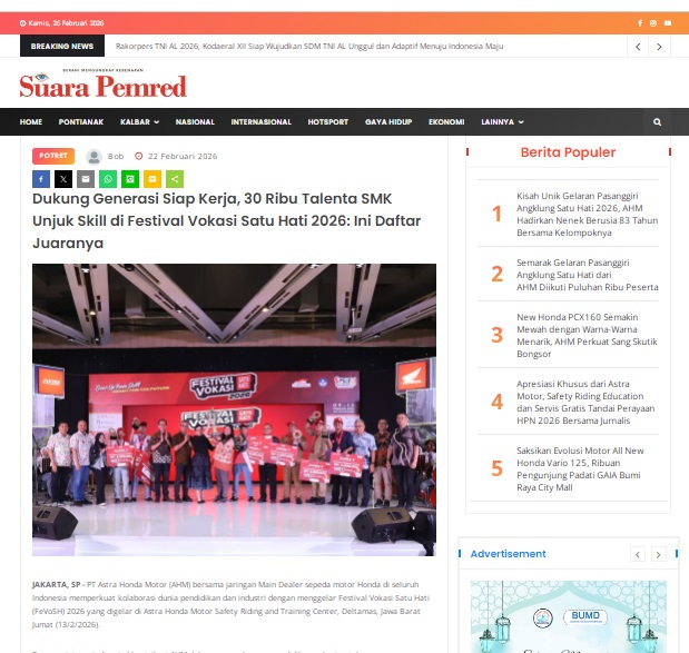Dukung Generasi Siap Kerja, 30 Ribu Talenta SMK Unjuk Skill di Festival Vokasi Satu Hati 2026: Ini Daftar Juaranya by masmul 22 Februari 2026 in Silahkan kunjungi https://www.suarapemredkalbar.com/read/potret/22022026/dukung-generasi-siap-kerja-30-ribu-talenta-smk-unjuk-skill-di-festival-vokasi-satu-hati-2026-ini-daftar-juaranya. You Might Like Regional Public Launching New ADV160 The SUV Pride Grand Launching New PCX 160 Truly Exceptional! Tetap hati-hati ya bro sist berkendara saat hujan.