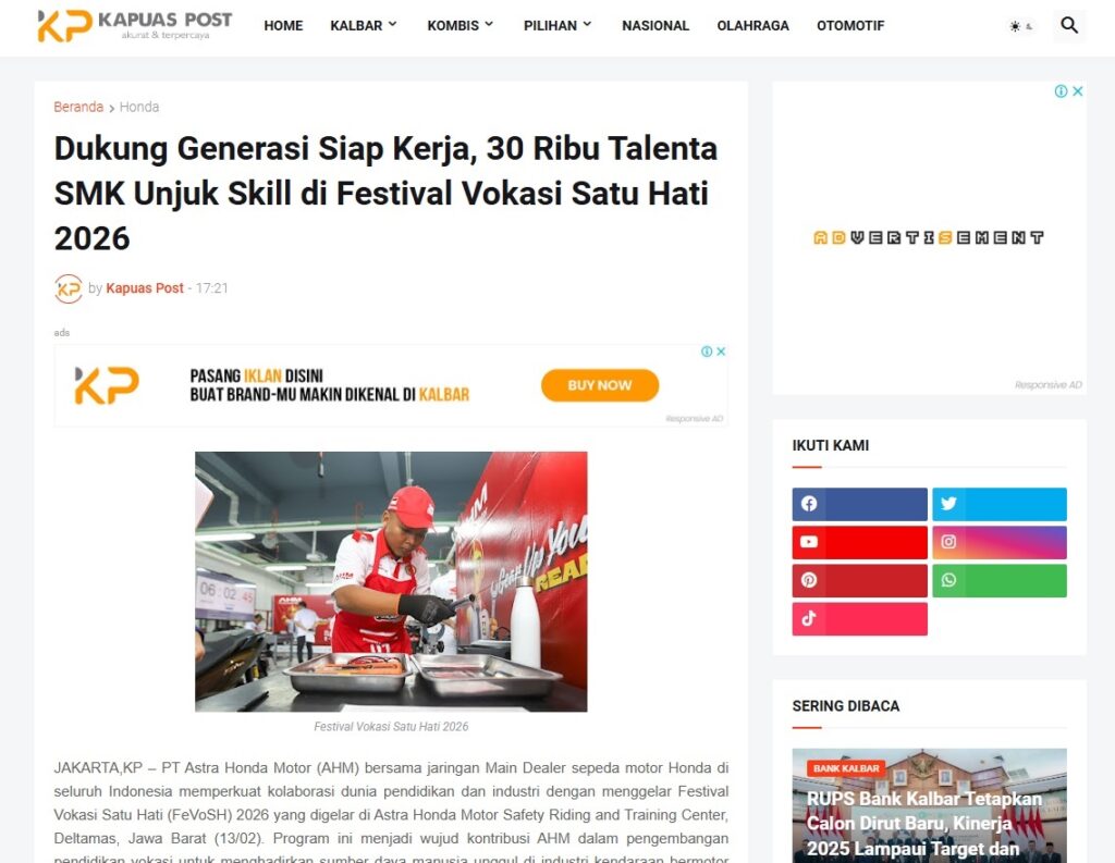 Dukung Generasi Siap Kerja, 30 Ribu Talenta SMK Unjuk Skill di Festival Vokasi Satu Hati 2026 by Muhammad Arif 18 Februari 2026 in Silahkan kunjungi https://www.kapuaspost.web.id/2026/02/dukung-generasi-siap-kerja-30-ribu.html. Tags: astra Astra Motor kalbar Astra Motor Pontianak astramotor honda kalbar pontianak sepeda motor You Might Like Regional Public Launching New ADV160 The SUV Pride Grand Launching New PCX 160 Truly Exceptional! Tetap hati-hati ya bro sist berkendara saat hujan.
