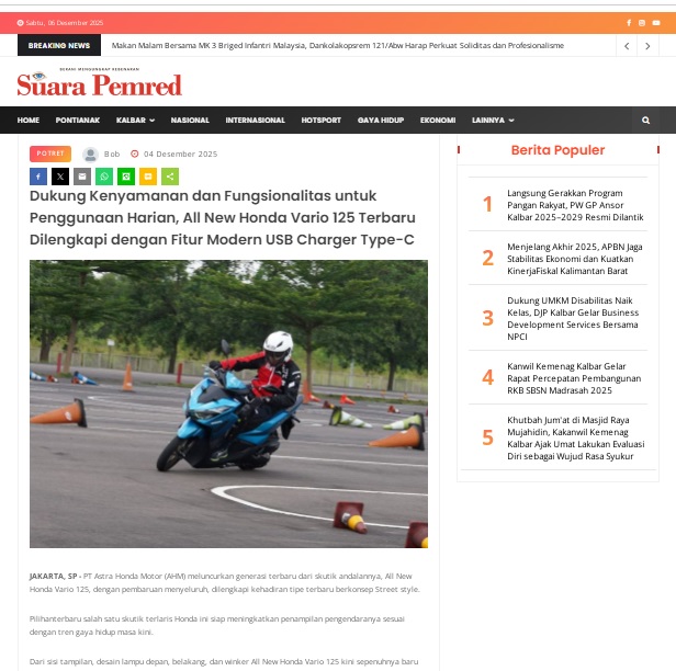 Dukung Kenyamanan dan Fungsionalitas untuk Penggunaan Harian All New Honda Vario 125 Terbaru Dilengkapi dengan Fitur Modern USB Charger Type-C by masmul 4 Desember 2025 in Silahkan kunjungi https://www.suarapemredkalbar.com/read/potret/04122025/dukung-kenyamanan-dan-fungsionalitas-untuk-penggunaan-harian-all-new-honda-vario-125-terbaru-dilengkapi-dengan-fitur-modern-usb-charger-type-c. You Might Like Regional Public Launching New ADV160 The SUV Pride Grand Launching New PCX 160 Truly Exceptional! Tetap hati-hati ya bro sist berkendara saat hujan.