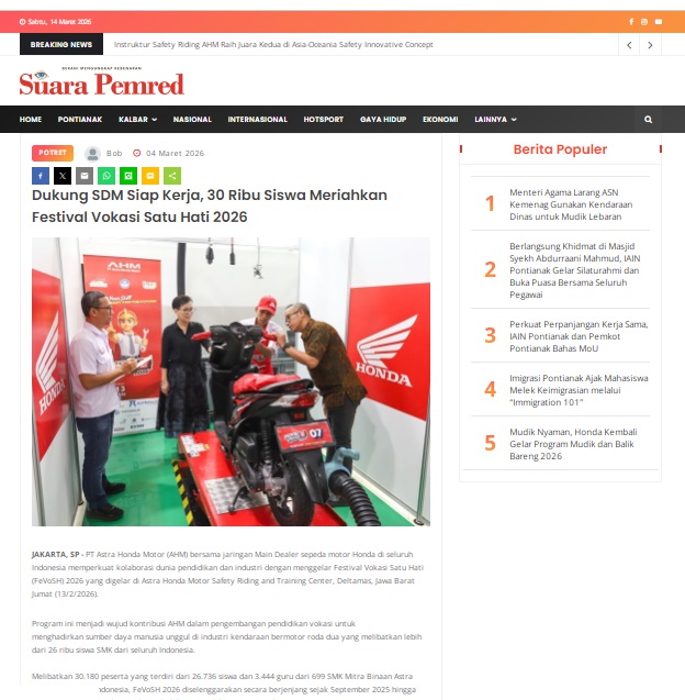 Dukung SDM Siap Kerja, 30 Ribu Siswa Meriahkan Festival Vokasi Satu Hati 2026 by masmul 4 Maret 2026 in Silahkan kunjungi https://www.suarapemredkalbar.com/read/potret/04032026/dukung-sdm-siap-kerja-30-ribu-siswa-meriahkan-festival-vokasi-satu-hati-2026. You Might Like Regional Public Launching New ADV160 The SUV Pride Grand Launching New PCX 160 Truly Exceptional! Tetap hati-hati ya bro sist berkendara saat hujan.