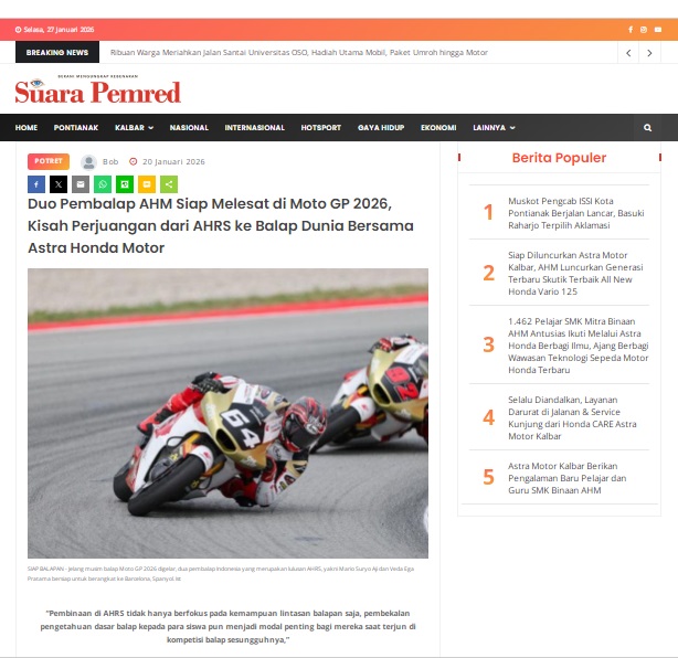 Duo Pembalap AHM Siap Melesat di Moto GP 2026, Kisah Perjuangan dari AHRS ke Balap Dunia Bersama Astra Honda Motor by masmul 20 Januari 2026 in Silahkan kunjungi https://www.suarapemredkalbar.com/read/potret/20012026/duo-pembalap-ahm-siap-melesat-di-moto-gp-2026-kisah-perjuangan-dari-ahrs-ke-balap-dunia-bersama-astra-honda-motor. You Might Like Regional Public Launching New ADV160 The SUV Pride Grand Launching New PCX 160 Truly Exceptional! Tetap hati-hati ya bro sist berkendara saat hujan.