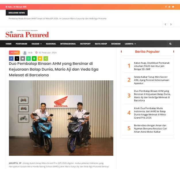 Duo Pembalap Binaan AHM yang Bersinar di Kejuaraan Balap Dunia, Mario Aji dan Veda Ega Melesat di Barcelona Photo of Duo Pembalap Binaan AHM yang Bersinar di Kejuaraan Balap Dunia, Mario Aji dan Veda Ega Melesat di Barcelona by masmul 2 Februari 2026 in Silahkan kunjungi https://www.suarapemredkalbar.com/read/potret/02022026/duo-pembalap-binaan-ahm-yang-bersinar-di-kejuaraan-balap-dunia-mario-aji-dan-veda-ega-melesat-di-barcelona. You Might Like Regional Public Launching New ADV160 The SUV Pride Grand Launching New PCX 160 Truly Exceptional! Tetap hati-hati ya bro sist berkendara saat hujan.